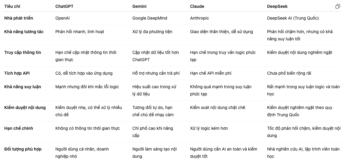 * DEEPSEEK : Cung cấp miễn phí với khả năng suy luận mạnh mẽ, nhưng kiểm duyệt nội dung nghiêm ngặt và tốc độ phản hồi chậm hơn.